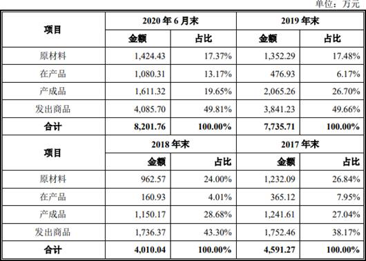2017年至2020年1-6月,达瑞电子存货中发出商品分别为1752.46万元、1736.37万元、3841.23万元、4085.70万元,占比分别为38.17%、43.30%、49.66%、49.81%。