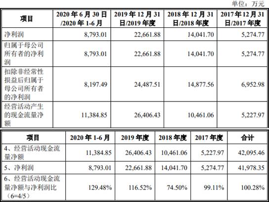 2017年至2020年1-6月,达瑞电子净利润分别为5274.77万元、1.40亿元、2.27亿元、8793.01万元,归母净利润分别为5274.77万元、1.40亿元、2.27亿元、8793.01万元;经营活动产生的现金流量净额分别为5227.97万元、1.05亿元、2.64亿元、1.14亿元。