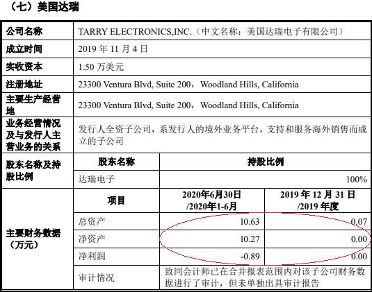 2019年、2020年1-6月,美国达瑞总资产分别为0.07万元、10.63万元,净资产分别为0.00万元、10.27万元,净利润分别为0.00万元、-0.89万元。