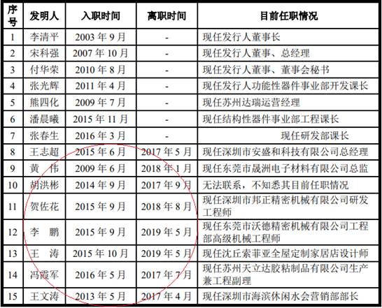 达瑞电子9项发明专利涉及的发明人共15人,其中8人已离职。其中,王志超于2015年6月入职,2017年5月离职;黄伟于2009年6月入职,2018年1月离职;胡洪彬于2014年9月入职,2017年9月离职;贺佐花于2015年9月入职,2018年8月离职;李鹏于2015年9月入职,2019年5月离职;王涛于2015年10月入职,2019年5月离职;冯霞军于2016年5月入职,2017年7月离职;王文涛于2013年5月入职,2017年4月离职。