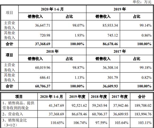 2017年至2020年1-6月,达瑞电子营业收入分别为3.66亿元、6.07亿元、8.67亿元、3.74亿元,主营业务收入分别为3.63亿元、6.00亿元、8.59亿元、3.66亿元;销售商品、提供劳务收到的现金分别为3.79亿元、5.92亿元、9.25亿元、4.13亿元。