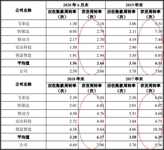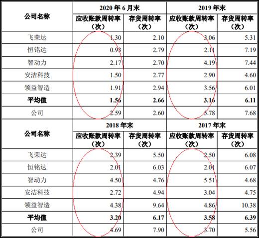 2017年至2020年1-6月,达瑞电子应收账款周转率分别为3.70次、4.69次、5.78次、2.59次,同行业上市公司均值分别为3.58次、3.20次、3.16次、1.56次。