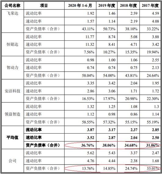 2017年至2020年1-6月,达瑞电子资产负债率(合并)分别为33.01%、24.74%、14.85%、13.76%,同行业上市公司均值分别为31.06%、34.68%、38.06%、36.76%。