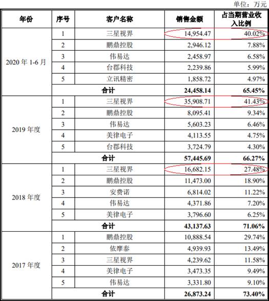 达瑞电子2017年第三大客户为三星视界,当年公司对其销售金额为4239.62万元,占营业收入比例为11.58%;2018年至2020年1-6月,达瑞电子第一大客户均为三星视界,公司对其销售金额分别为1.67亿元、3.59亿元、1.50亿元,占营业收入比例分别为27.48%、41.43%、40.02%。