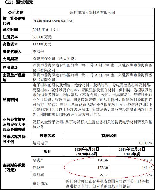2019年、2020年1-6月,深圳瑞元总资产分别为183.34万元、170.36万元,净资产分别为141.42万元、132.30万元,净利润分别为3.84万元、-9.12万元。