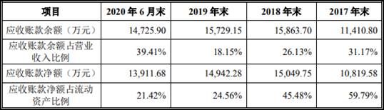2017年至2020年1-6月,达瑞电子应收账款余额分别为1.14亿元、1.59亿元、1.57亿元、1.47亿元,占营业收入比例分别为31.17%、26.13%、18.15%、39.41%。