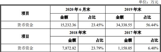2017年至2020年1-6月,达瑞电子货币资金分别为1158.05万元、7872.82万元、3.43亿元、1.52亿元,占流动资产比例分别为6.40%、23.79%、56.44%、23.45%。