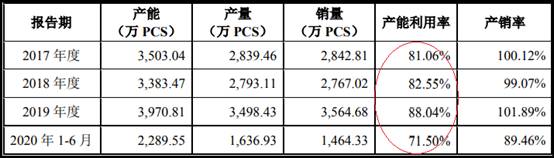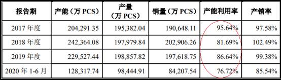2017年至2020年1-6月,达瑞电子消费电子功能性器件产能利用率分别为95.64%、81.69%、86.64%、76.72%。