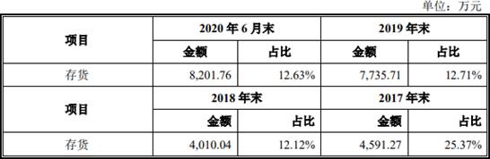 2017年至2020年1-6月,达瑞电子存货分别为4591.27万元、4010.04万元、7735.71万元、8201.76万元,占流动资产比例分别为25.37%、12.12%、12.71%、12.63%。