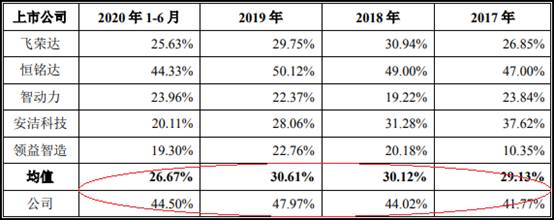 2017年至2020年1-6月,达瑞电子综合毛利率分别为41.77%、44.02%、47.97%、44.50%,同行业上市公司均值分别为29.13%、30.12%、30.61%、26.67%。