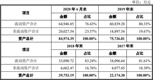 2017年至2020年1-6月,达瑞电子资产总计分别为2.22亿元、3.98亿元、7.57亿元、8.50亿元,其中,流动资产合计分别为1.81亿元、3.31亿元、6.08亿元、6.49亿元,非流动资产合计分别为4077.65万元、6662.47万元、1.49亿元、2.00亿元。