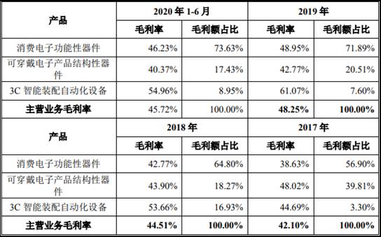 2017年至2020年1-6月,达瑞电子主营业务毛利率分别为42.10%、44.51%、48.25%、45.72%,其中,消费电子功能性器件毛利率分别为38.63%、42.77%、48.95%、46.23%,可穿戴电子产品结构性器件毛利率分别为48.02%、43.90%、42.77%、40.37%,3C智能装配自动化设备毛利率分别为44.69%、53.66%、61.07%、54.96%。
