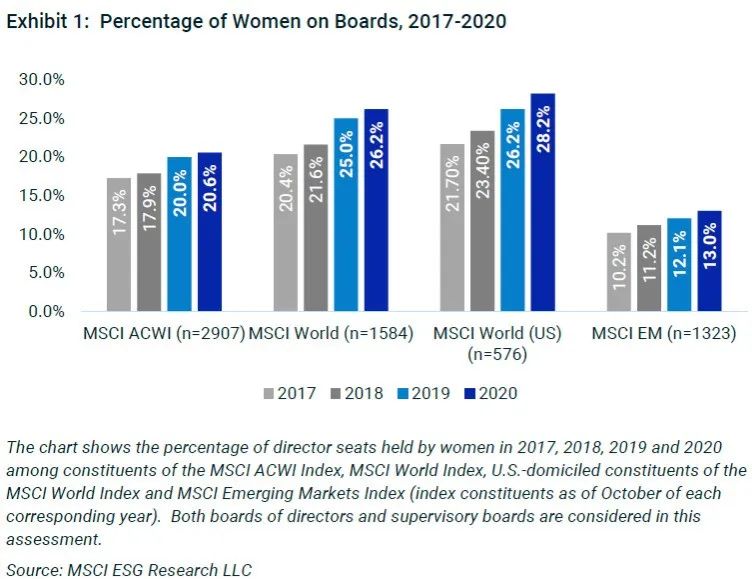 研究结果显示,在MSCI全球市场指数(MSCI ACWI Index)成分股公司中,女性董事比例的增幅在2020年出现明显放缓,仅从20.0%增长到20.6%,微增0.6个百分点。