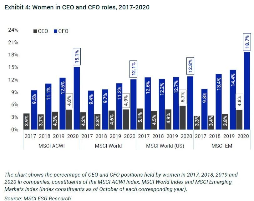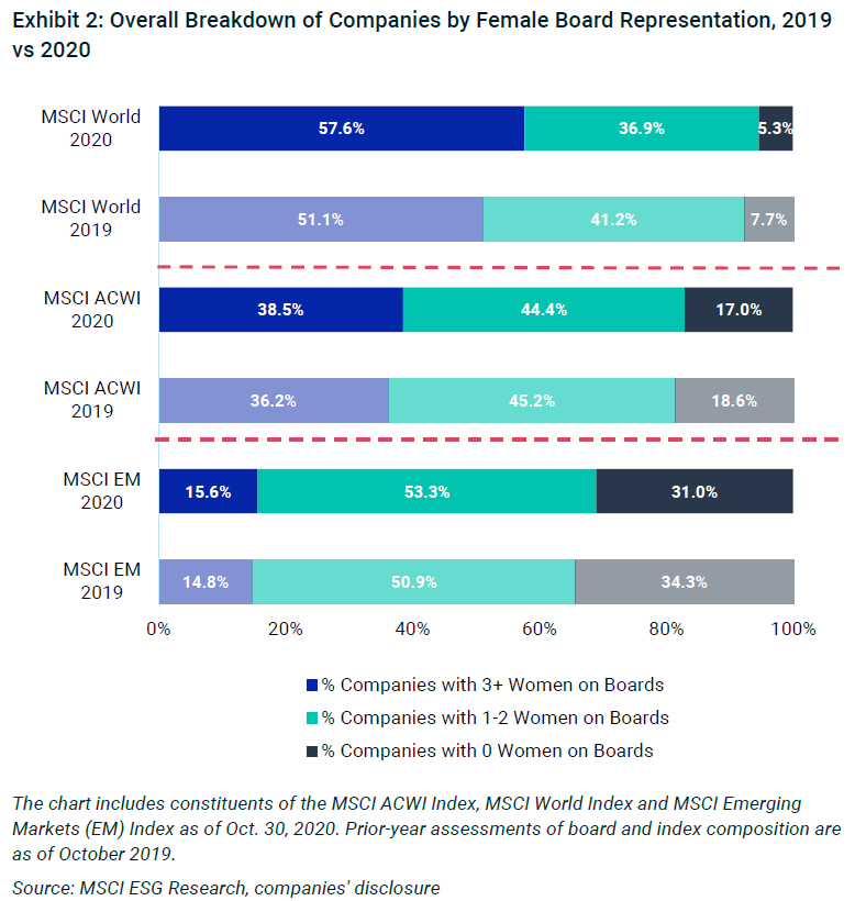 在MSCI全球指数(MSCI World Index)中,达到至少有三名女性董事这一门槛的公司占比出现显著上升——从2019年的51.1%上升到2020年的57.6%。