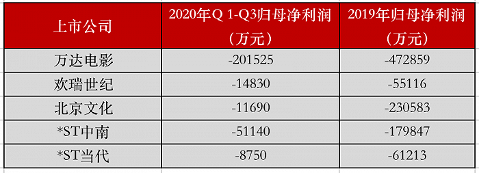 根据主板和中小板的ST及退市规则, 上市公司连续两年亏损则会被实行退市风险警示(*ST)。记者根据2019年和2020年前三季度的归母净利润统计发现,去年年报和今年三季报均显示亏损的影视公司有3家——万达电影、欢瑞世纪和北京文化(鹿港文化由于主营业务变更,故不计算在内)。值得注意的是在,这三家都是影视行业的头部公司。
