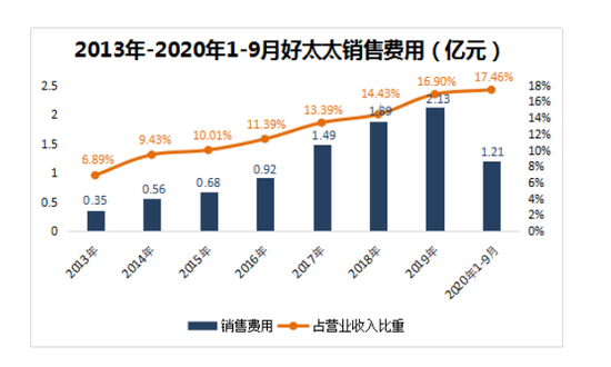 过去7年,好太太不断攀升的销售费用也印证了这一点。2013年-2019年,好太太销售费用从0.35亿元增长至2.13亿元,增长了5倍;同期,销售费用占营收的比重从6.89%提升至16.9%,截至三季度末,销售费用占营收的比重已达17.46%。值得一提的是,不断攀升的销售费用,并未给公司带来营收规模的扩张,好太太的营收从2019年以来一直呈现疲软状态。