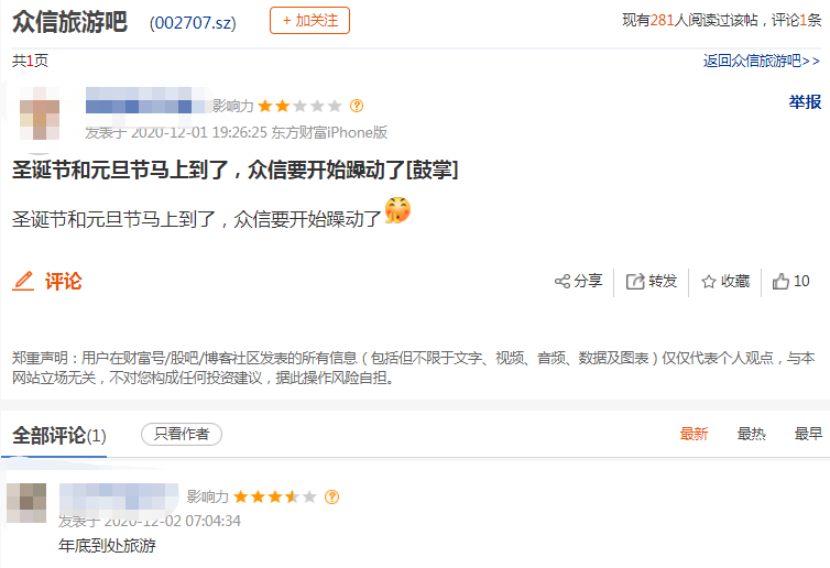 虽然业绩短期内受到影响,但众信旅游后续平稳穿越行业周期并不难。有股吧网友表示,“圣诞节和元旦节马上到了,众信要开始躁动了。”另一名网友则回复道:“年底到处旅游”。