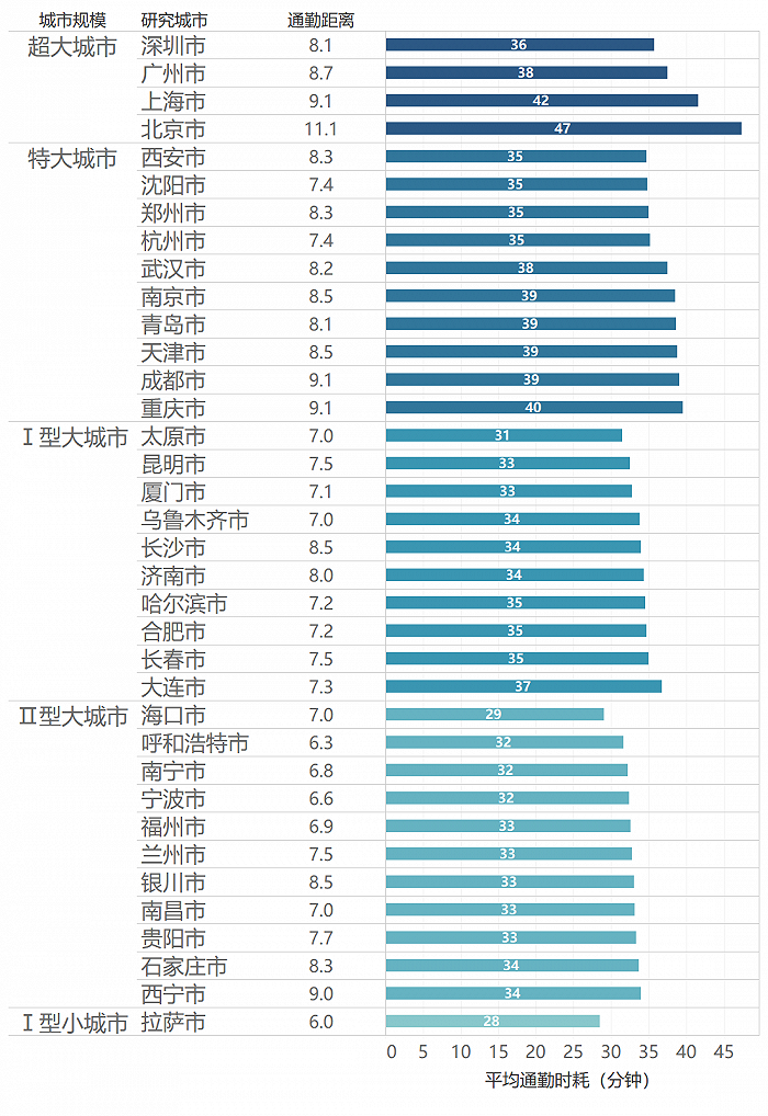 全国主要城市单程平均通勤时耗,来源:中国城市规划设计研究院公众号