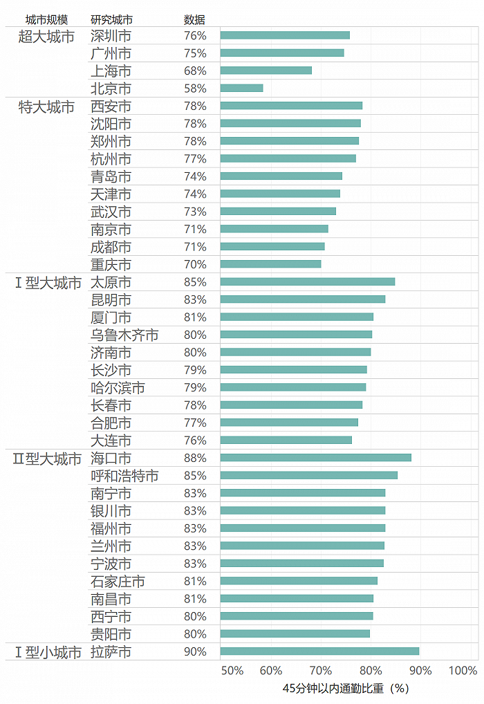 事实上,许多城市也未达到所在城市规模分区的标准线,以I型大城市为例,太原市、昆明市、厦门市分别以45分钟以内通勤占比85%、84%、81%远低于平均水平。