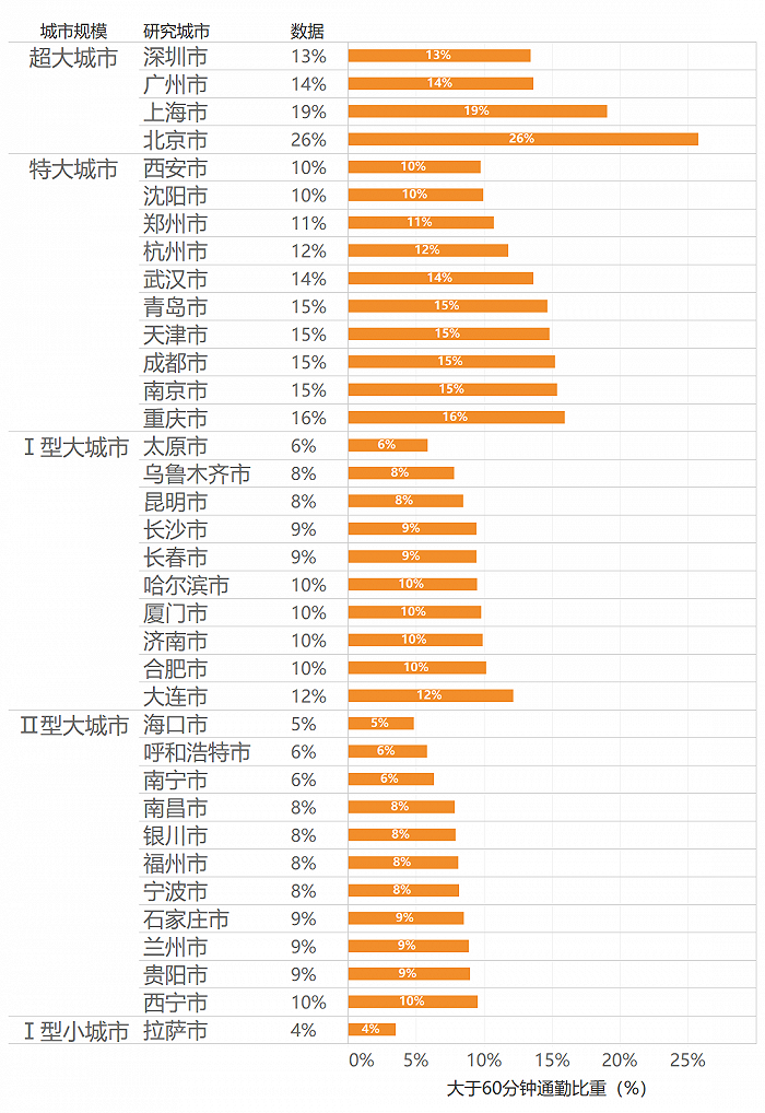 该《报告》以单程大于60分钟的中心城区通勤人口比重,作为城市超长通勤问题的量度,将之作为极端通勤的参考数据。