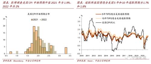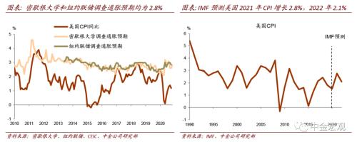 美国通胀预期较疫情前上升。密歇根大学和纽约联储对未来12个月CPI通胀预期调查均为2.8%。IMF秋季世界经济展望报告预测2021和2022年美国CPI增长2.8%和2.1%。Bloomberg调查2021和2022年美国CPI市场预期分别为1.9%和2%。通货膨胀保值国债隐含的5年和10年通胀预期分别为1.7%和1.8%