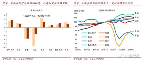 衣着和交通价格下跌,疫情期间出行减少抑制相关需求。10月份,美国CPI衣着和交通价格同比分别下降5.6%和3.4%。交通价格受汽车燃料价格和航空机票价格拖累。和4月份低点相比,近期交通价格有所回升。