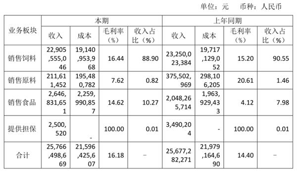 根据正大投资披露的公司债券2019年年度报告显示,近年来,正大投资的业绩基本保持稳定。2018年和2019年,正大投资的营业收入分别为257.43亿元和257.94亿元,净利润分别为12.64亿元和12.32亿元。同期,“饲料销售”在正大投资整体营收中的占比分别为90.55%和88.90%。