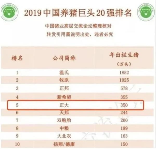 事实上,在养猪行业,正大集团已属于中国头部企业。统计数据显示,2019年出栏量第一的温氏为1852万头,牧原出栏1025万头,正大出栏约350万头,规模在国内排在第五。