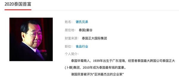 这正大投资可大有来头。它作为卜蜂国际(00043.HK)的全资子公司,卜蜂国际则是泰国跨国企业正大集团旗下香港上市公司,而正大集团的背后正是“泰国首富家族”谢氏家族。