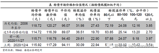 转股溢价率上涨。截至12月4日,全市场的转股溢价率均值30.09%,环比上升0.48百分点;纯债溢价率均值22.94%,环比上升0.03个百分点。其中平价80元以下、80-100元、100-120元、120元以上转债的转股溢价率均值59.86%、23.82%、10.42%、3.54%,环比分别变动+1.98、-0.25、+1.24、+0.43个百分点。