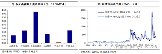 上周中证转债指数上涨0.17%,日均成交量(包含EB)358.83亿元,环比上升1.9%,我们计算的转债全样本指数(包含公募EB)上涨0.18%。同期沪深300指数上涨1.71%、创业板指上涨4.27%、上证50上涨1.23%。