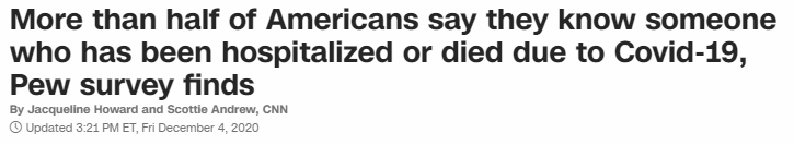 据美国媒体报道,在刚刚过去的一周,新冠肺炎成为美国人的第一大死因。皮尤研究中心日前公布的一项民调结果显示,多达54%的美国成年人表示,他们认识的人中有人因感染新冠肺炎入院或死亡。