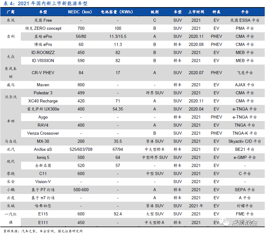 从国内市场来看,除主要车企高端电动子品牌在2021年集中上市交付以外,造车新势力新车型上市,包括Tesla Model Y、蔚来EC6、零跑C11等,以及滴滴与比亚迪合作开发的专门满足运营端需求的车型D1、更多类似宏光mini替代低速电动车市场需求的车型,极大丰富电动车产品品类,有望孕育更多爆款车型。