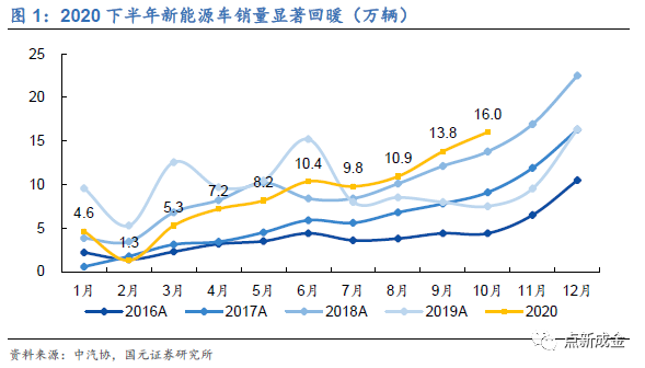从2019年6月补贴退坡以来,我国新能源汽车产销同比“十连降”。今年更由于新冠疫情的影响,上半年累计销量36.9万辆,同比下降41%。三季度以来产销大幅回暖。2020年1-10月,国内新能源汽车产销分别为91.4万辆和90.1万辆,同比分别下降9.2%和7.1%,降幅较1-9月分别收窄9.5pcts和10.6pcts; 10月国内新能源汽车产销创10月单月历史新高,其中产量为16.7万辆,同比上涨69.7%,环比上涨19.6%;销量达16万辆,同比大幅上涨104.5%,环比上涨13.9%。今年上半年新能源车行业受到疫情冲击市场较为低迷,下半年以来产销量已连续四月高于去年同期,源于私人对于新能源车消费显著提升。