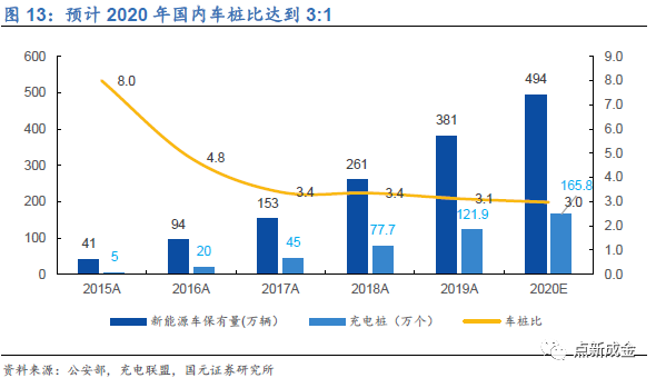从2015年到2020年,国内新能源汽车车桩比逐渐降低。2020年新基建将新能源汽车充电桩纳入其中,充电基础设施建设提速。2015年至2019年我国充电桩保有量从6.6万台增加到121.9万台,同期新能源汽车保有量从42万辆增加到381万辆,对应车桩比从2015年6.4:1下降到2019年3.1:1,充电配套有所改善,预计2020年进一步下降至3:1。