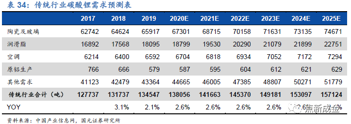 预期在2025年传统行业碳酸锂需求将达15.71万吨,CAGR为2.62%,需求稳定增长。传统行业碳酸锂需求主要包括陶瓷及玻璃的制造、润滑脂的制造、空调制造、原铝生产、其他需求等。根据中国产业信息网,2019年传统行业对碳酸锂的合计需求约为13.45万吨,预计2019至2025年陶瓷及玻璃制造的碳酸锂需求平均复合增长率为2.1%,润滑脂碳酸锂需求平均复合增长率为3.89%,空调碳酸锂需求平均复合增长率为1.7%,原铝生产碳酸锂需求平均复合增长率为1.4%,其他用途碳酸锂需求增长率为3%。
