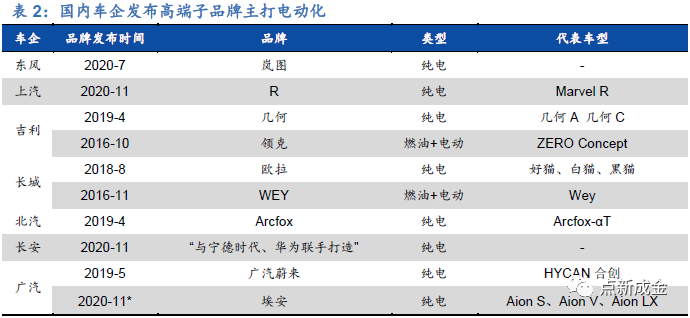 电动化是自主品牌高端化的契机,本土车企电动子品牌向上突破。2020年是自主品牌高端化的拐点之年,北汽、东风、上汽、长安相继宣布推出独立高端子品牌,长安汽车宣布与华为、宁德时代合作打造高端智能汽车品牌。2020年11月,广汽宣布“广汽埃安”品牌独立运营,埃安品牌经过几年的发展,率先成为产销超10万辆的高端电动品牌,品牌影响力、技术与平台化实力等方面已经具备独立的条件。几乎同时,上汽R品牌脱离荣威宣布独立,成为上汽乘用车三个自有品牌之一,即R品牌、MG和荣威。电气化大潮之下,高端市场正发展成为国内新能源汽车的主战场,自主品牌定位向上显著突破。