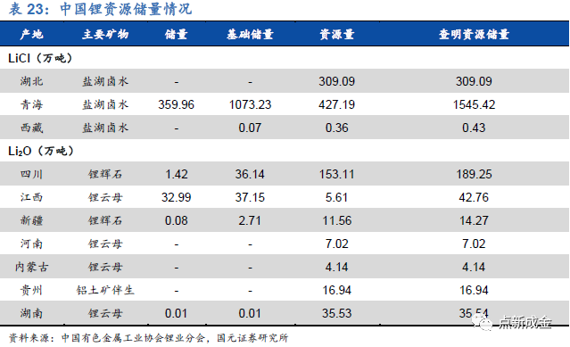 中国资源丰富但开发程度低。虽然中国的锂资源储量排名世界第二,但受开发条件和技术手段等限制,卤水锂和矿石锂的开发程度都较低。卤水锂方面,青海柴达木盆地盐湖都是高镁锂比的卤水,相关的提锂技术还未达到工业化生产的成熟度;而西藏扎比耶盐湖卤水中的锂以碳酸锂形态存在,易于提取,但是因交通、电力、能源等条件,限制了大规模开发。矿石锂方面,四川锂矿成矿条件优越,资源丰富,其中阿坝、甘孜两州探明储量大,具备大规模开发的条件,但矿山所在的自然环境恶劣,海拔高,基础设施配套差,开采和尾矿处理难度大;江西宜春是我国重要的锂云母矿产地,已开发多年,但开采规模较小,矿石品质较低,部分锂盐生产中的技术难题尚未突破,锂开发处于试生产阶段。
