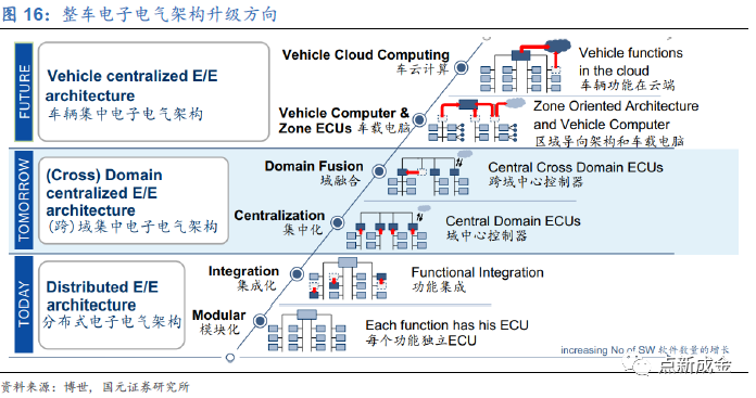 “软件定义汽车”已经成为共识,整车电子电气架构升级加速推进。在电子电气架构从分布式向域控制器、超级中央计算架构演进的过程中,传感器及ECU等硬件的数量会急剧减少,而其在汽车价值链中的地位则降得更快。相比之下,芯片及软件的权重则越来越高。