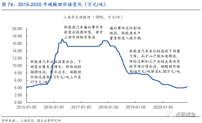 碳酸锂市场具有传统周期的特点,即需求主导价格,供给的变化落后于需求变动。碳酸锂已大宗商品化,即价格的上涨主要源于需求的增长,同时库存在碳酸锂价格上涨阶段扮演催化剂,在下行阶段成为抑制剂。