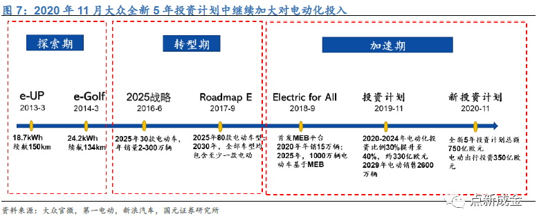 传统整车巨头加速转型电动化。随着动力电池成本下降,电动车产品盈利趋势明确,并且各国鼓励电动车消费限制燃油车,各大传统车企巨头如大众、通用、戴姆勒、宝马等加快电动化脚步,在众多车企宣布的2025规划中,对电动化转型的投资额纷纷达到百亿美元。其中以大众最为典型,大众于2016年6月、2017年9月分别发布“Together-Strategy 2025”和“Roadmap E”确定集团层面进行电动化转型,“Roadmap E”规划到2025年推出超过80款电动车,到2030年旗下所有车型均至少有一款电动车。于2018年9月、2019年11月分别发布“Electric for All”和未来投资规划。前者首发专为电动车开发的MEB平台;后者将电动化2020-2024年投资比例从30%提升到40%,约330亿欧元,到2029年电动车累计销量提升至2600万辆。在2020年11月公布的总额为730亿欧元的全新5年投资计划中,大众的电动化投资额提升至350亿欧元,以此加速整个集团的转型。同时2020年11月,通用汽车官方宣布将在电动车和自动驾驶领域加大投入,未来五年规划投资270亿美元,投资力度超过其燃油车项目,2025年底前将在全球推出30款电动车型。至此主要国际车企均宣布未来5年的电动转型计划,未来5年将是车企全面电动化转型的关键阶段。
