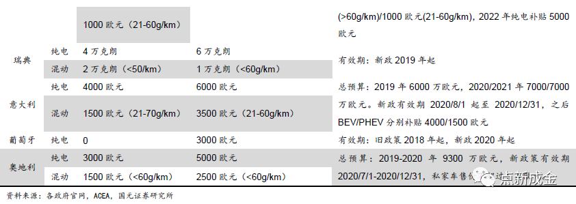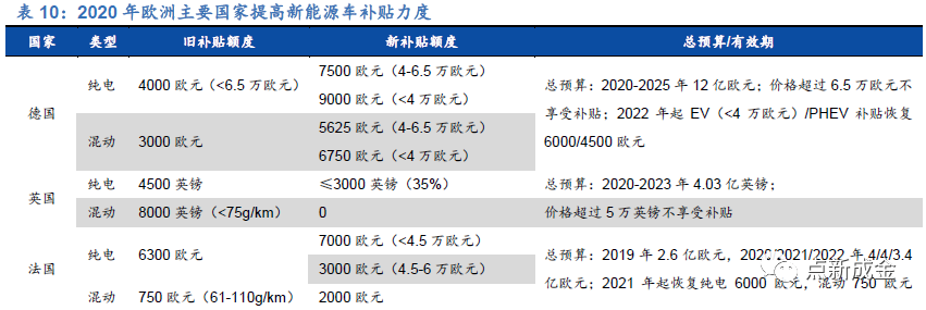 欧洲新能源单车补贴约6000欧元,德法英意主要国家提升补贴预算。2020年开始特别是疫情扶持政策下,欧盟层面及欧洲主要汽车销量国家纷纷提升对新能源车补贴力度。2020年7月21日欧盟通过7500亿元复苏计划法案,其中大量资金用于绿色转型。德国宣布2020-2025年总预算12亿欧元新能源汽车补贴基础上,将全面提高单车补贴25%-50%,电动车单车补贴最高到9000欧元。法国新能源汽车补贴总预算从2019年2.6亿欧元提升至2020-2022年分别4、4、3.4亿欧元,5月底宣布增加80欧元援助计划,将单车补贴6000欧/辆增加至7000欧/辆。意大利将总补贴预算由2019年的6000万欧元提升至2020-2021年的7000万欧元。此外瑞典、荷兰等国家均提高补贴力度。