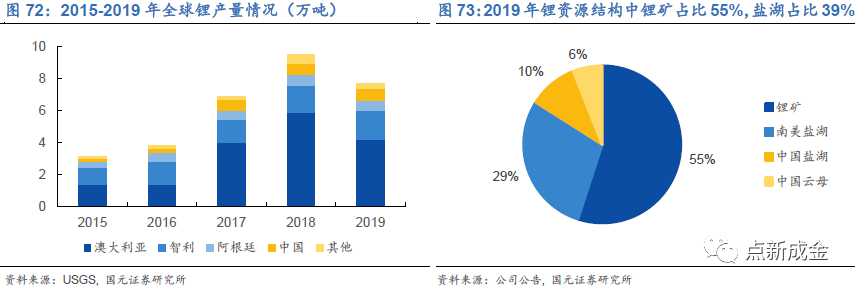 盐湖提锂难度更高,矿石提锂占据主流。2019年全球55%的锂资源供应来自于矿石体系,39%的锂资源供应来自于盐湖体系。全球锂产量在经历2015-2018年的高速增长后开始回落,2019年全球锂资源产量7.7万吨,其中澳大利亚占据54.55%,智利占比23.38%。