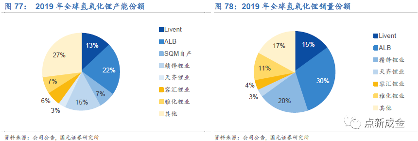 全球氢氧化锂市场集中度较高,2019年前四家一线厂商产销份额过半。全球厂商按照市场份额可以分为三个梯队。1)具备品质溢价的一线厂商,包括Albemarle、赣锋锂业、Livent和SQM,与全球车企或电池龙头建立了长期战略合作关系,最先受益于全球高镍化的需求;2)准一线厂商,包括衡州永正、成都开飞和俄罗斯产能,正逐渐进入全球供应体系;3)二线厂商,主要包括产线和工艺较为成熟的国内供应商,具备扩产计划。