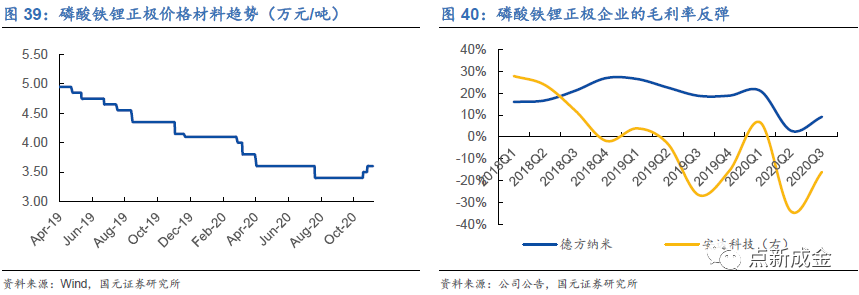 磷酸铁锂价格逐渐企稳回升。2019年以来磷酸铁锂正极材料从4.95万/吨持续下滑,截至2020年10月下降至3.4万/吨,2020年11月磷酸铁锂正极价格回升至3.6万/吨,环比提升5.88%。从单季度磷酸铁锂正极企业盈利端来看,厂商毛利率在Q3出现反弹。龙头企业德方纳米2020Q3毛利率为9.18%,安达科技2020Q3毛利率为-16.07%,盈利能力触底恢复。