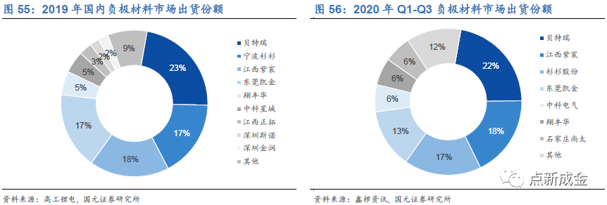 国内负极呈现四大多小格局。国内负极四大企业分别为贝特瑞、杉杉股份、璞泰来和凯金能源,2019年CR4达到74%,相对于2018年提升3.18pct。贝特瑞是天然石墨负极龙头企业,连续多年出货量全国第一,2019年市占率22.6%,下游客户包括松下、LG、三星、索尼和比亚迪等,是松下负极主供应商;璞泰来是国内人造石墨龙头企业,2019年市占率17.5%,下游客户包括ATL、CATL、LG和三星等;杉杉股份是国内人造石墨的领军企业,2019年市占率17%,下游客户有ATL、LG、CATL、比亚迪和国轩高科等;凯金能源2019年市占率17%,下游客户主要是宁德时代。