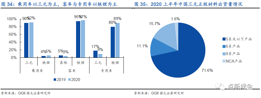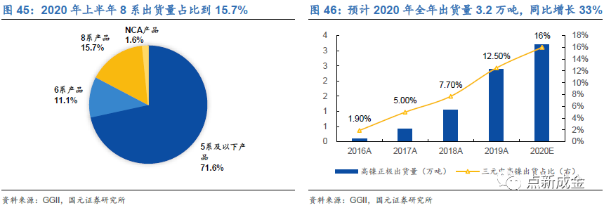 三元材料以5系及以下产品为主。从三元正极产品的型号来看,2020上半年的三元材料市场仍以5系三元产品为主,占比71.6%,同比增长0.5个百分点;其次为高镍8系(含NCA)产品,占比17.3%,同比上升4.5个百分点;6系产品从第二位降至第三位,占比11.1%,同比下降8.2个百分点。