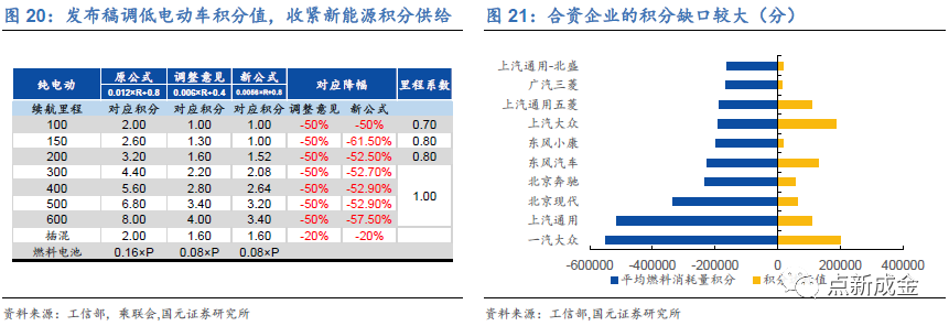 中国新版双积分政策趋严,托底新能源车长期增长。2020年6月29日,工信部正式发布《关于修改〈乘用车企业平均燃料消耗量与新能源汽车积分并行管理办法〉的决定》,自2021年1月1日起施行。正式稿对新能源积分计算更为严格,同时加入技术调整系数鼓励电动技术持续进步。1)对于主要合资车企来说新能源积分缺口更大,倒逼其加速推出新车型,同时预计2021年欧洲新能源车产品加速在国内投放,以满足新能源积分要求。2)由于2020年疫情影响,双积分政策为纾困车企而延缓结算期,2021年新能源积分抵偿2020年负积分,且21年开始新能源积分供给过剩局面改变,积分价值将提高。