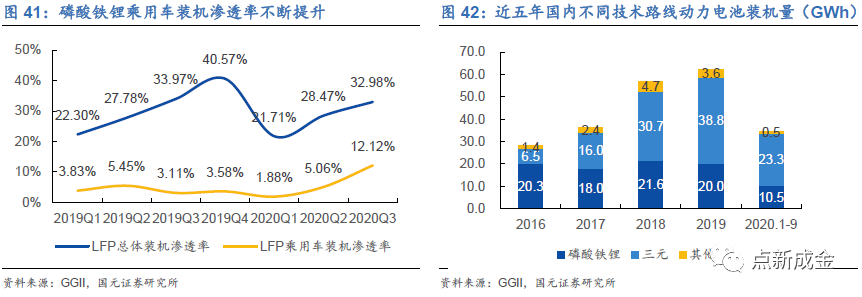 下半年开始磷酸铁锂装机占比持续提升。此前政策层面补贴直接挂钩续航里程与能量密度,推动乘用车电池三元化。2019年开始补贴政策引导的弱化、磷酸铁锂能量密度提升及电池包层面精简带来的成本下降,铁锂性价比优势进一步凸显,乘用车技术路线开始分化,尤其是特斯拉Model 3铁锂版本交付、比亚迪汉、宏光mini等车型热卖,乘用车铁锂装机率大幅提升。在商用车装机量大幅下滑的情况下,2020Q3乘用车铁锂装机量占比达到12%,环比提升7个百分点。总体渗透率达到32.98%,达到2019年全年水平。整体来看,磷酸铁锂在新能源汽车中回暖趋势已非常显著。