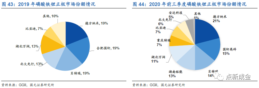 铁锂正极材料原材料占比大,规模化生产降低单位成本空间较小,从而难以取得超额优势,盈利能力较弱,格局相对分散。2019年我国磷酸铁锂产量8.9万吨,同比增速52.4%,企业盈利能力普遍出现下滑,然而在行业洗牌期,头部企业逐步扩大市占率。德方纳米出货量大幅增长,量增弥补价跌,毛利开始企稳回升。